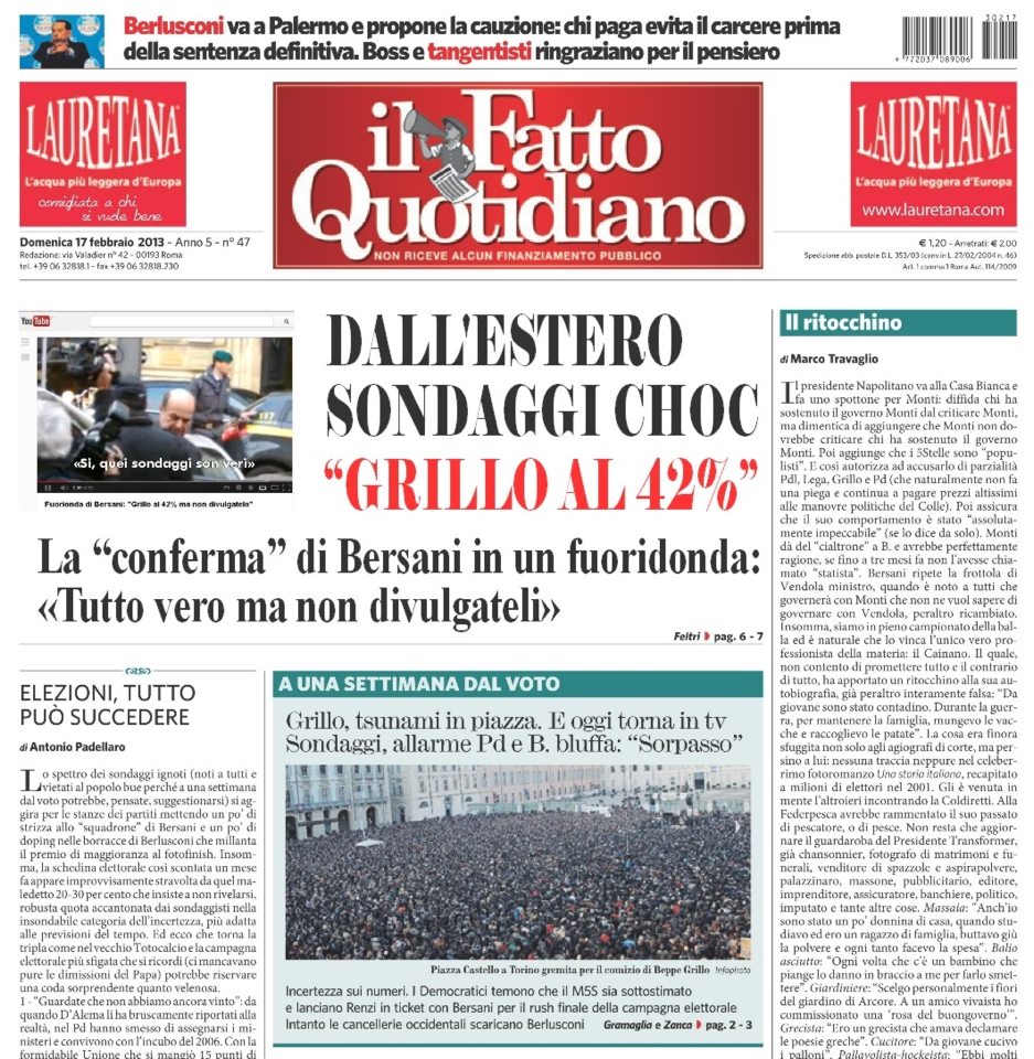 Ancora una giornata campale, tra le notizie cui non vogliamo credere dei sondaggi esteri che ci danno numeri troppo grandi da far, davvero esagerati (come nella falsa pagina del Fatto qui sotto)ed i numerosi problemi pratici che ci fanno correre a destra e manca.